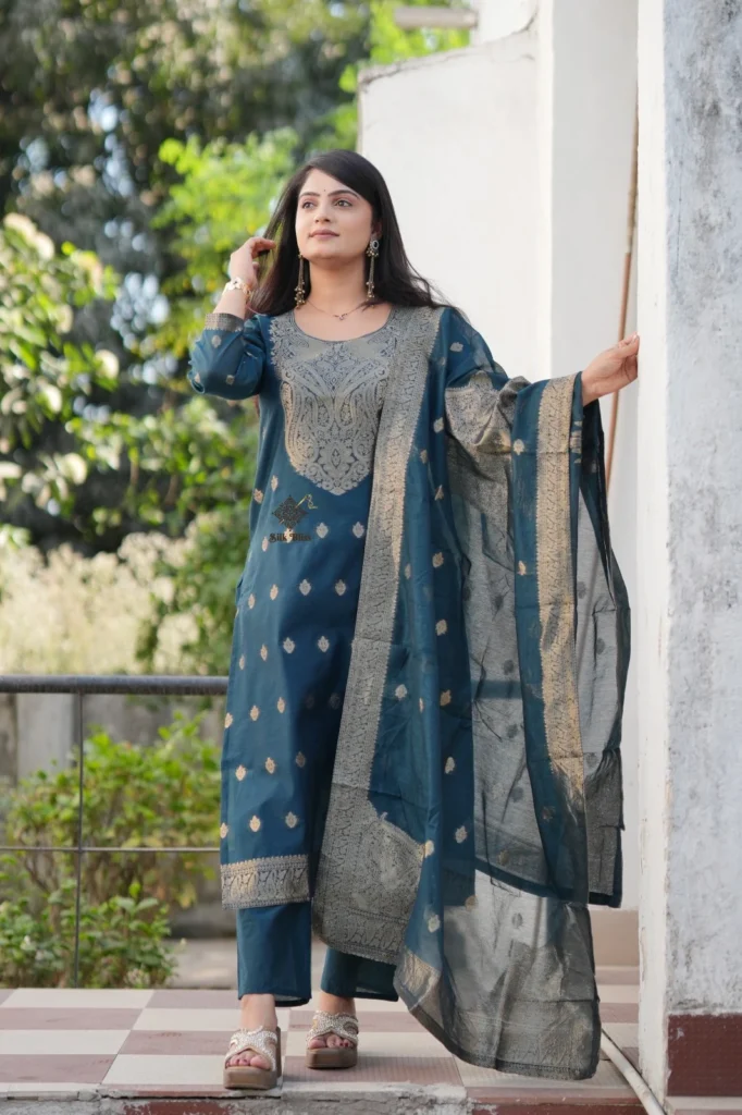 Deep Navy Jacquard Suit Set with Zari Border Dupatta