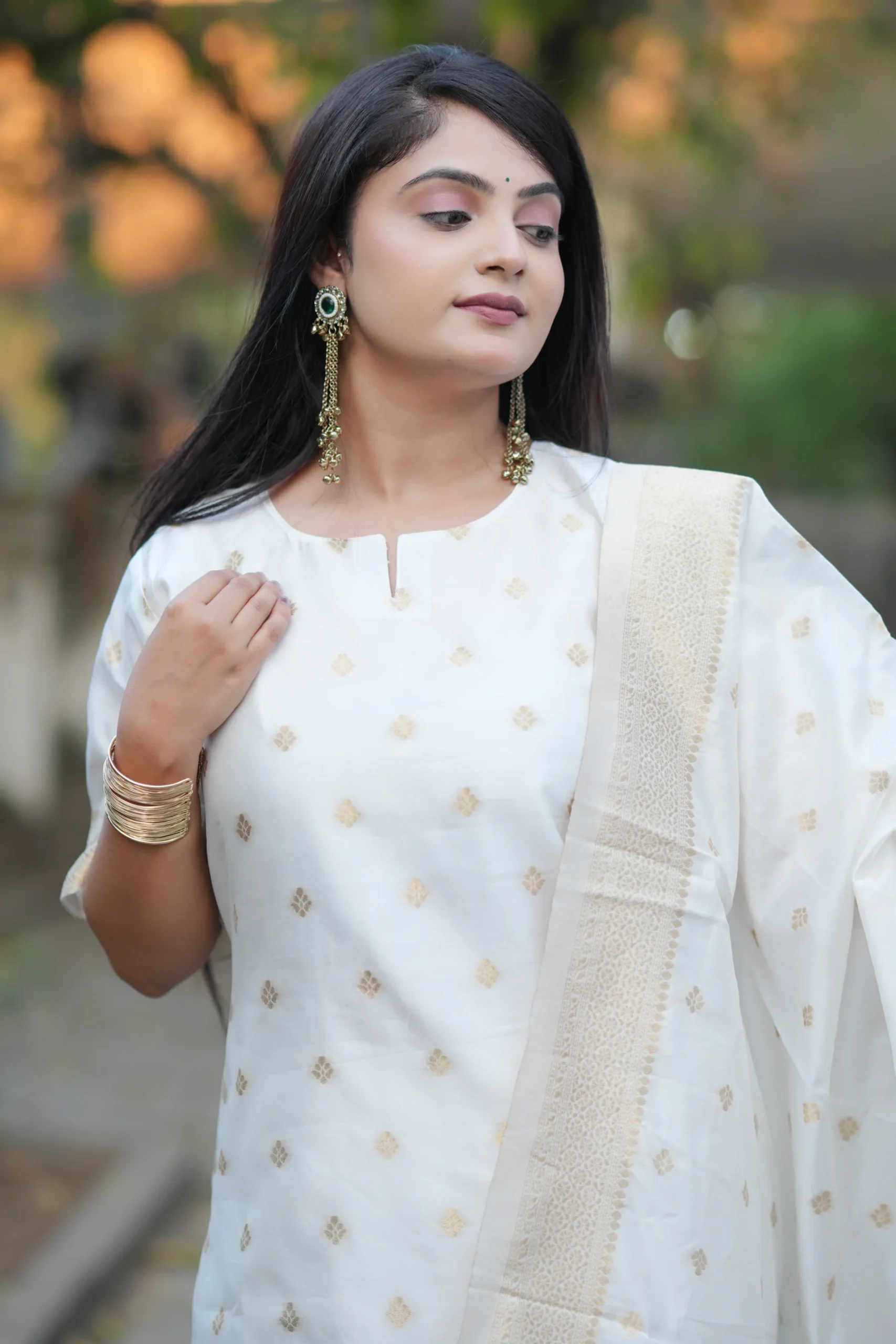 The soothing ivory base is adorned with delicate woven patterns, while the dupatta is enhanced with elegant borders and subtle vibrant accents—making it ideal for festive occasions, casual gatherings, and daytime celebrations.