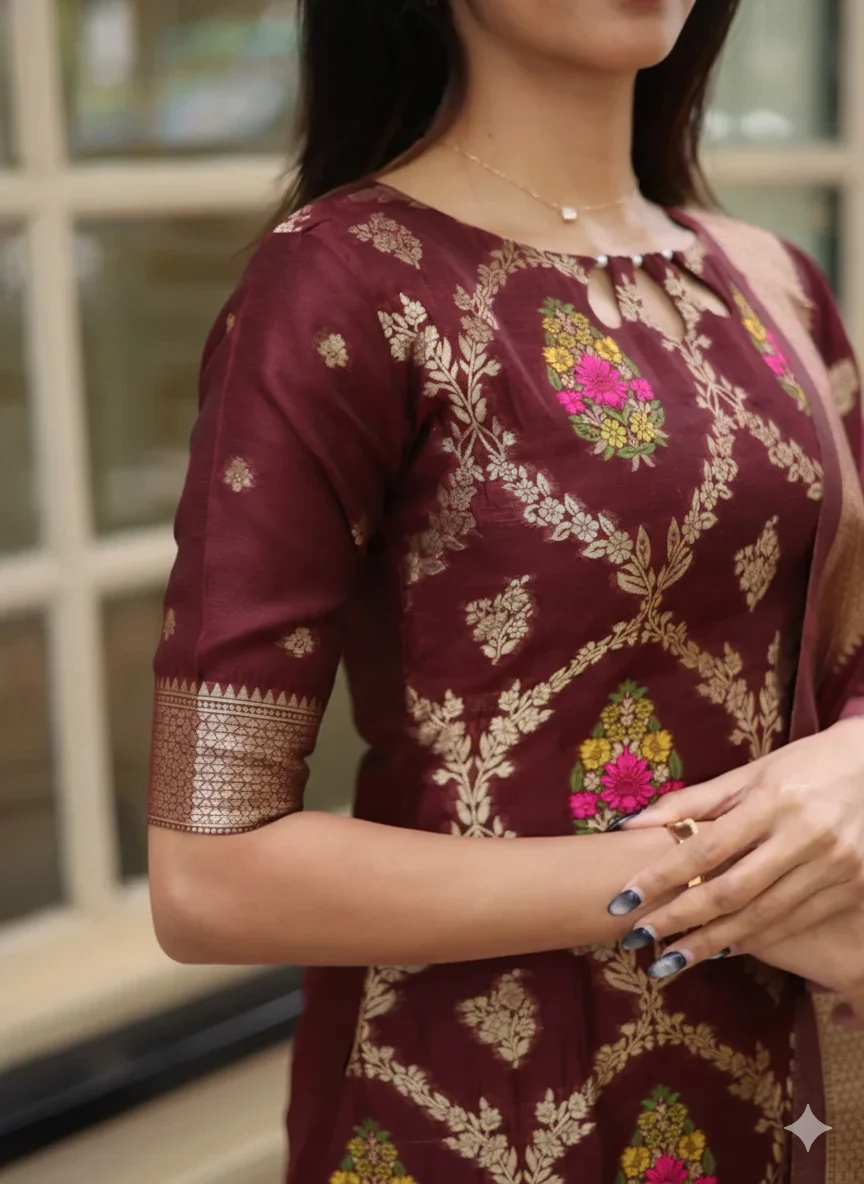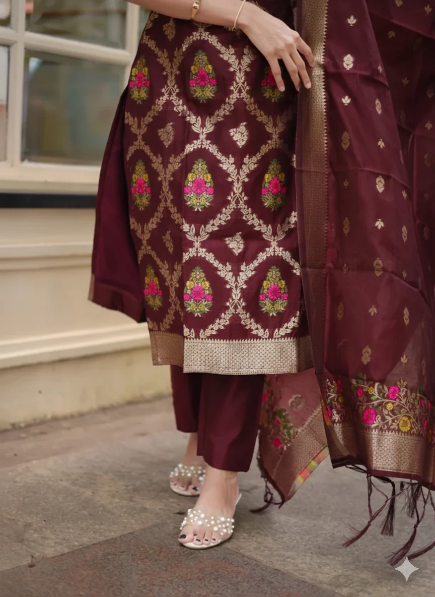 The ensemble is complemented by a beautifully woven dupatta, enhanced with subtle zari borders and traditional detailing, giving it a refined and festive appeal. The deep wine hue exudes sophistication, making it an ideal choice for festive occasions, celebrations, and elegant gatherings.