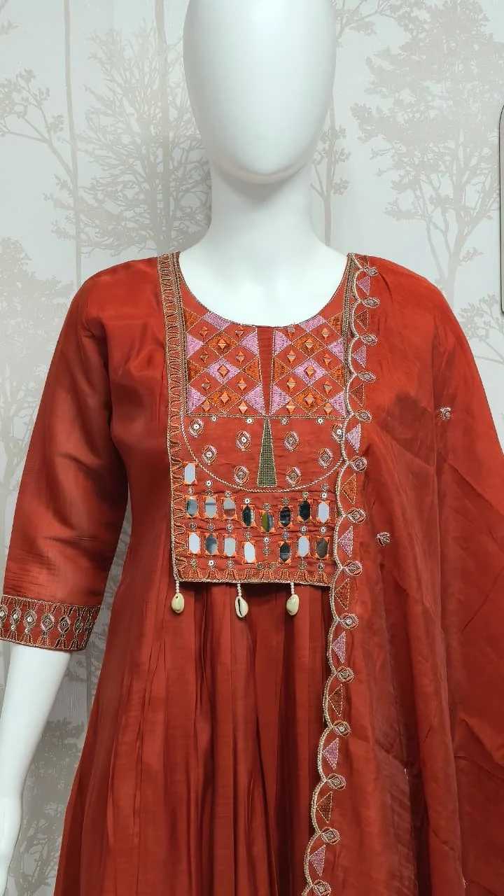 Elegant Mal Chanderi 3 Piece Kurti Set with Dupatta & Pant – Embroidered Festive Wear (Rust Red)