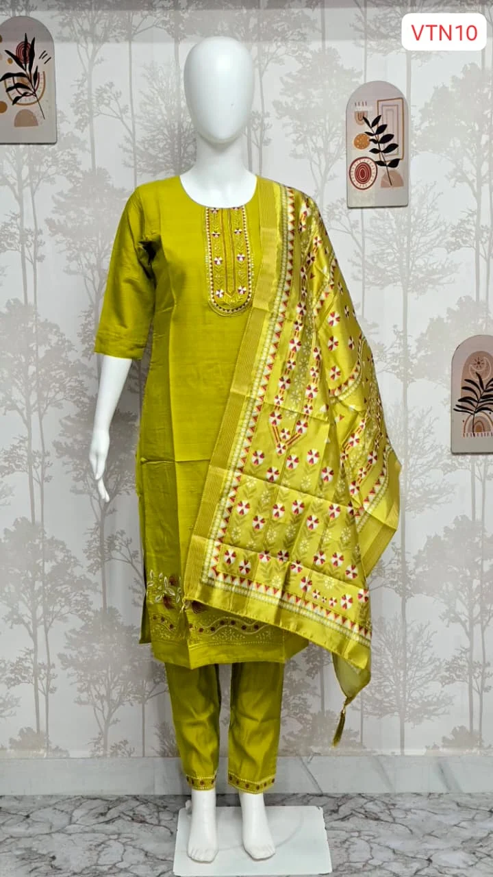 The Kurti features a sophisticated round neck with dense Zari and thread embroidery, complemented by mirror-style highlights. The matching trousers are tailored for comfort with detailed border work at the ankles. Accompanied by a heavy Jacquard woven dupatta with traditional motifs, this ensemble is designed for sellers looking to offer a high-end, boutique-finish product.