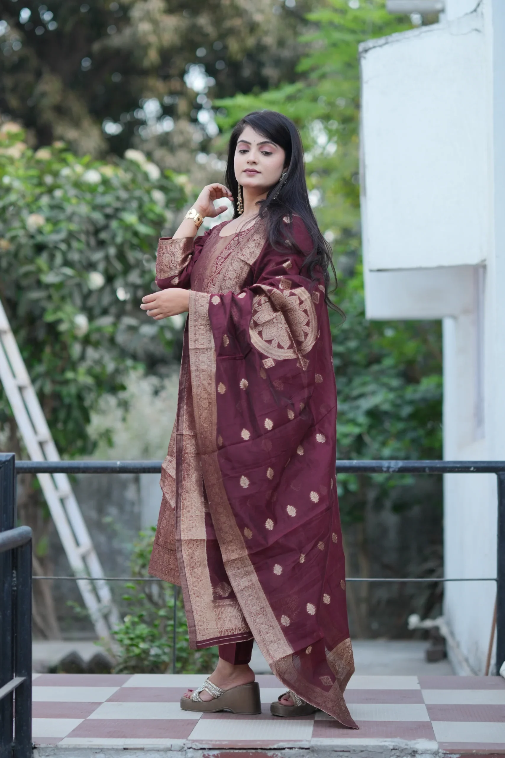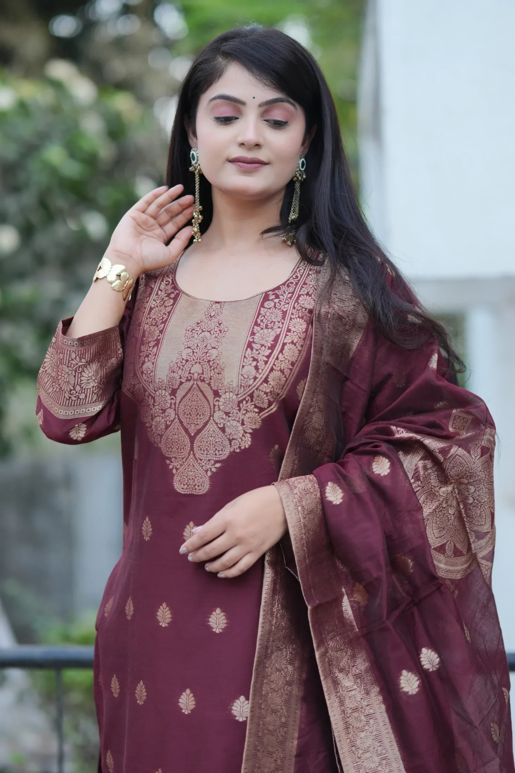 Festive Special Maroon Woven Kurti Set with Dupatta