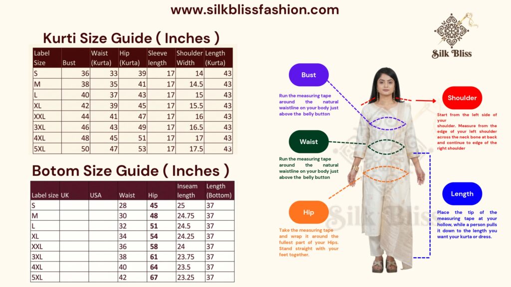 Size & Fit: Straight fit, calf-length kurta. Refer to the size chart for details.