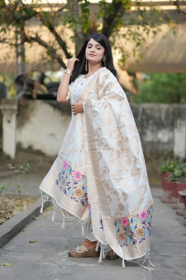 Festive Woven Gold Banarasi-Style Salwar Kameez Set in White