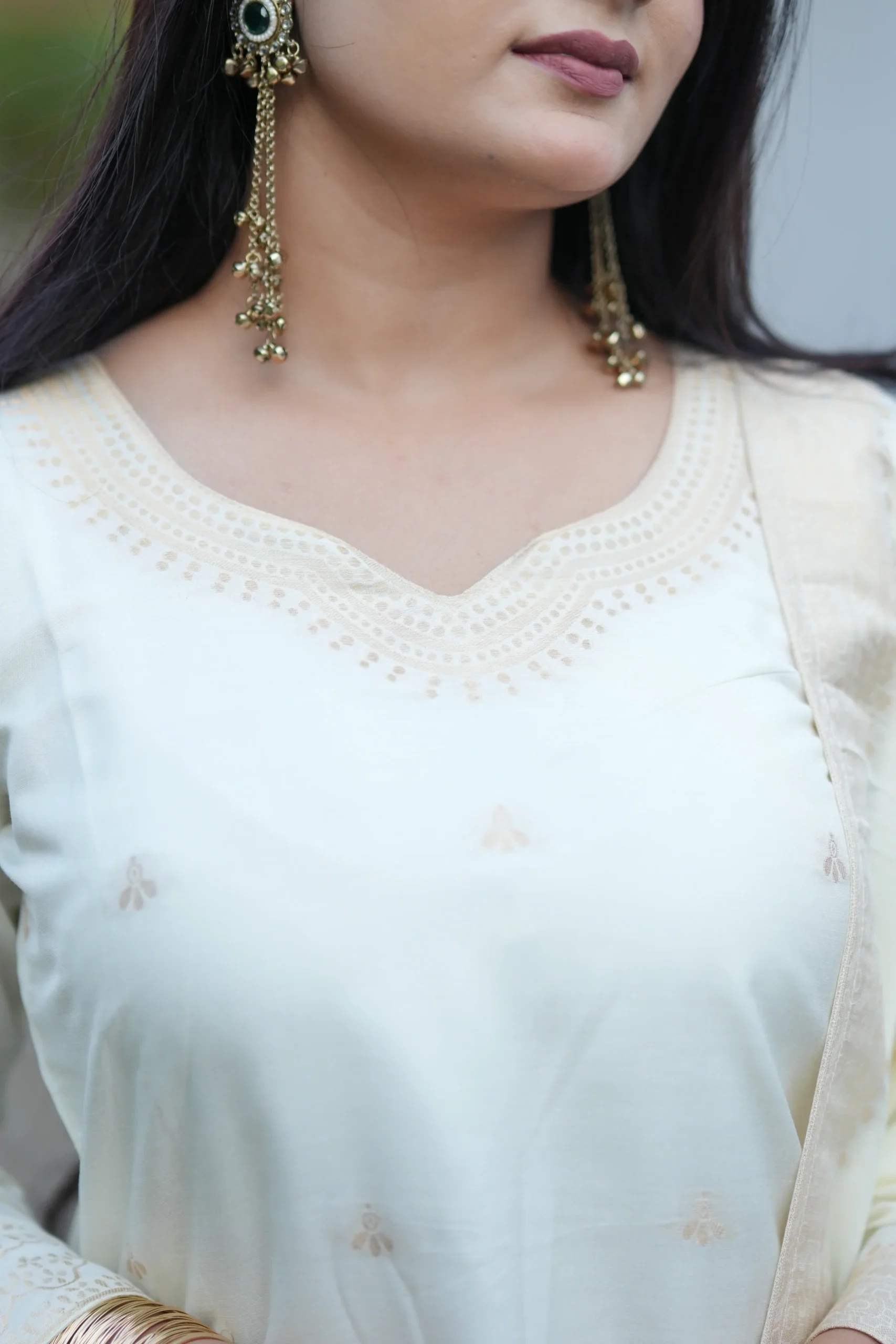 Premium Off-White Heavy Jacquard Woven Kurti Pant Dupatta Set