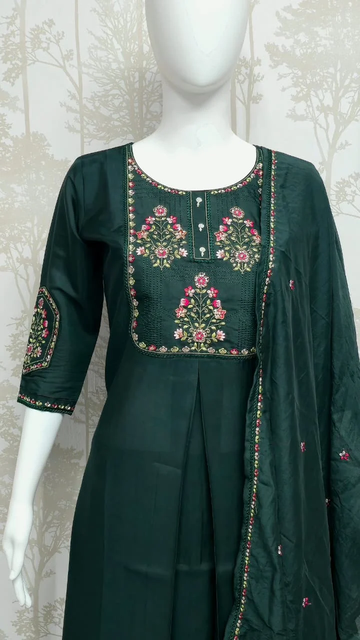 Premium Roman Silk 3-Piece Set: Intricate Floral Neck & Sleeve Embroidery